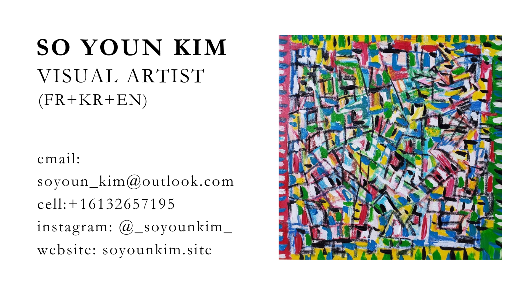 So Youn enjoys practicing abstract paintings in the style of what she calls as postmodern contemporary abstract expressionism with an emphasis on intellect from her education and creativity from her talent. So Youn remembers her childhood when her mother took her to the Picasso special exhibition in Seoul, Korea. So Youn enjoys her multicultural, academic and creative journey in Canada since she was 14 and likes to ask thought-provoking questions in intellectual conversation.